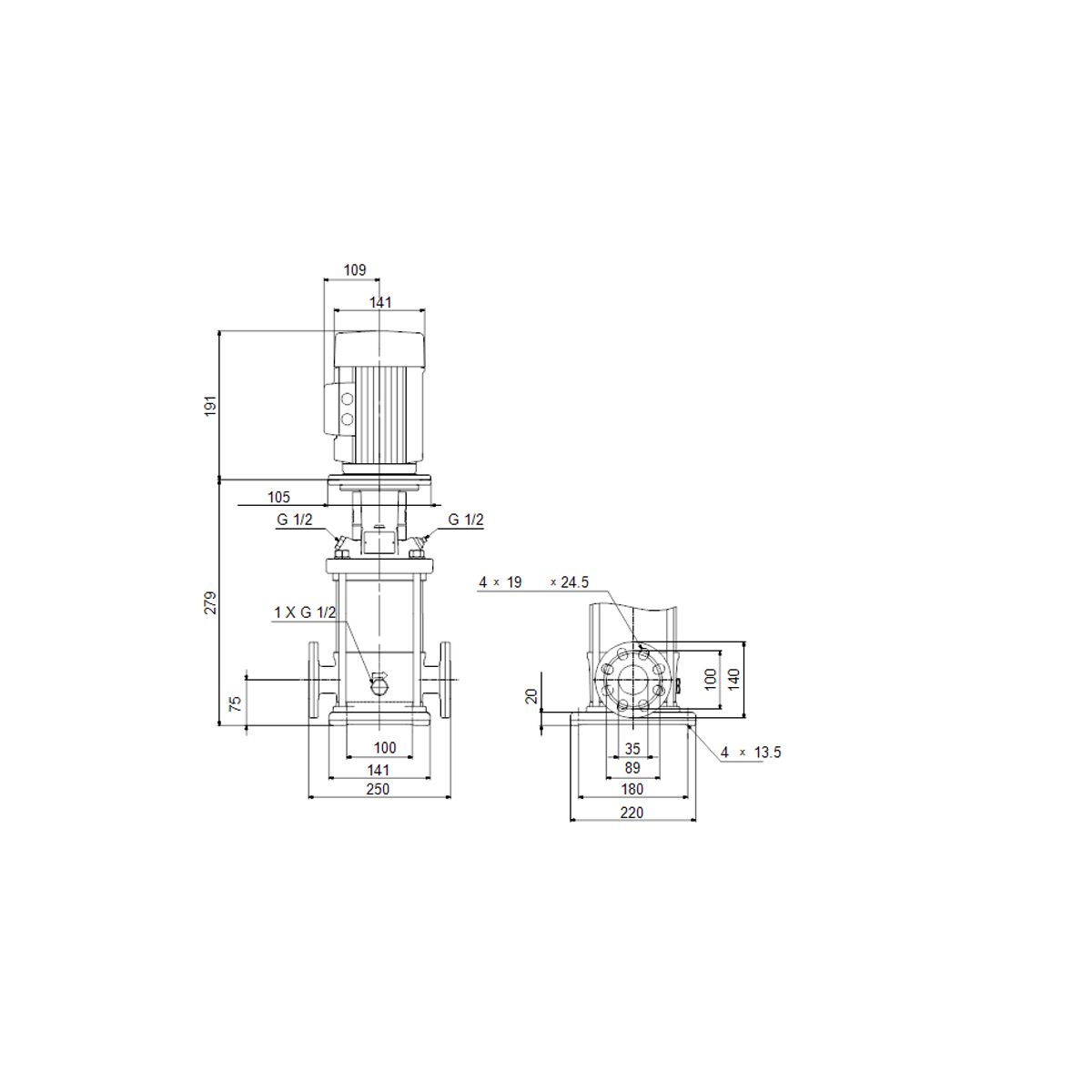 Vertikale Inline-Zentrifugalpumpe, die für die Installation in Rohren oder auf einem Fundament konzipiert ist. Die Pumpe ist nicht selbstansaugend, d.h. sie muss mit Flüssigkeit vorgefüllt werden, um ordnungsgemäß zu funktionieren.